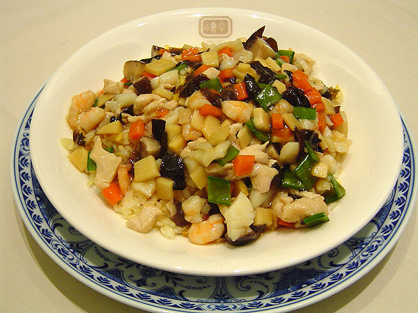 作り方 (1)材料は全部、小さいサイの目にカットします。 (2)エビ、イカ、鶏肉はカットした後さっとボイルしておきます。 (3)野菜をカットしたものもボイルしておきます。 (4)ご飯を卵で炒め、塩、胡椒でうすめに味付けして、 炒飯を作るような感じで器に盛ります。 (5)鍋にスープ(水)をはり、A・Bの材料と調味料を鍋の中に入れ、一度沸かします。 (6)水とき片栗粉でとろみをつけ、Cの器にかけてできあがり。